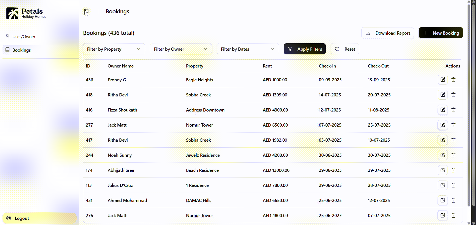 Petals Holiday Homes is a Dubai-based provider of premium holiday rentals, offering a curated portfolio of apartments and villas for short- and mid-term stays. Alongside its guest-facing services, Petals required an internal digital solution to simplify property management, streamline bookings, and provide property owners with real-time insights. The result was Petals CRM—a custom-built system designed to empower both administrators and users with efficient booking and income management tools.